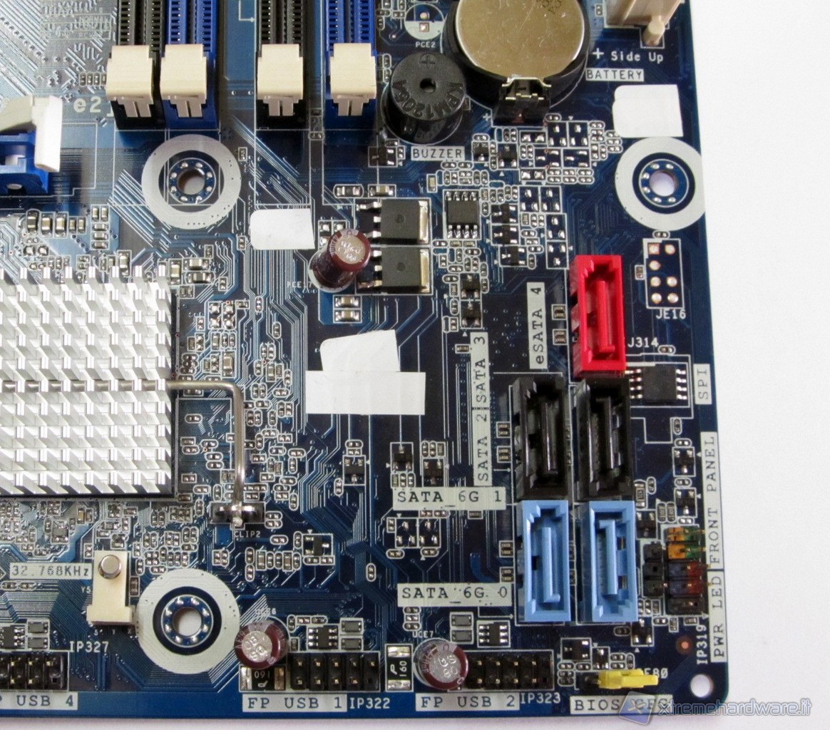 Infine possiamo osservare gli otto connettori USB on-board, i due connettori SATA 6 Gb/s (celesti), e tre connettori SATA 3 Gb/s di cui uno compatibile eSATA (nero/rosso); questo sistema è supportato dall’Intel Rapid Storage Technology per il RAID 0, 1, 5, e 10.