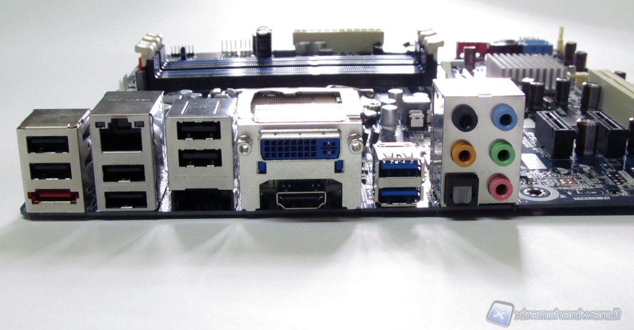 Nello specifico, iniziamo a descrivere le principali caratteristiche di questa scheda madre iniziando dal pannello I/O posteriore, ove possiamo trovare le due uscite video DVI-I e HDMI, 6 porte USB 2.0 (nere) e due porte gestite dal nuovo controller USB 3.0 (blu); oltre a questo possiamo vedere l’uscita della porta LAN supportata dal controller Intel 82579V Gigabit Ethernet Controller, una porta eSATA ed infine il blocco dedicato alle uscite audio dell’Intel High Definition Audio supportato dal codec Realtek ALC892.